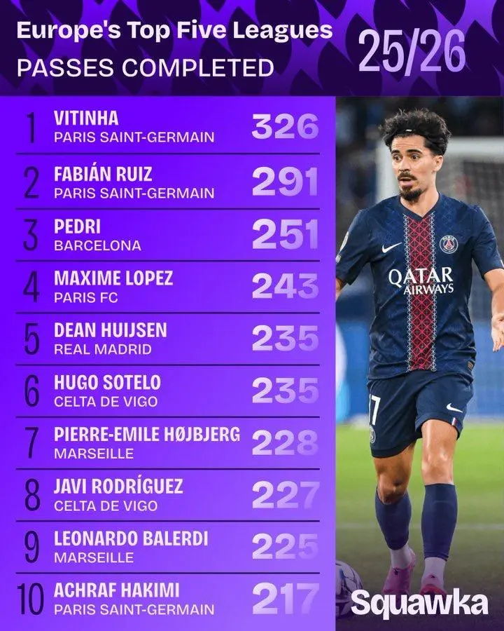 虎扑09月11日讯 数据机构Squawka统计了本赛季以来,欧洲五大联赛完成传球最多的前十名球员。来自巴黎的维蒂尼亚以326次排名第一,同样来自巴黎的法比安-鲁伊斯以291次排名第二。